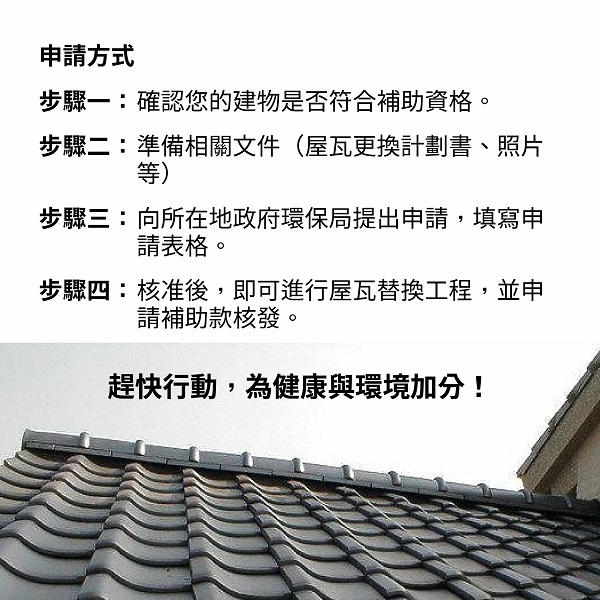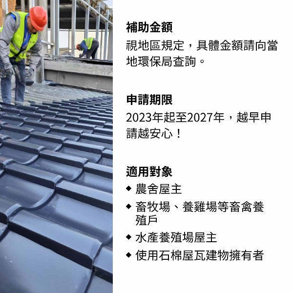 環境部向行政院爭取十六億元經費,補助民眾移除石綿屋瓦產生的費用,可向各地方環保局提出申請補助,由政府委託廠商並支付每公噸約四.五萬元處理費,但過去並未將畜牧場納入補助對象,資源循環署組長陳俊融表示,經報核准後,十一月十二日已將畜牧場納入,並於廿日邀集各地環保局討論,預計明年開始執行,依農業部畜牧場名冊,到今年六月為止,全台共有一萬八二四○家畜牧場,比對後有四六二一家、約一萬五七四六棟建築物還有石綿屋瓦。