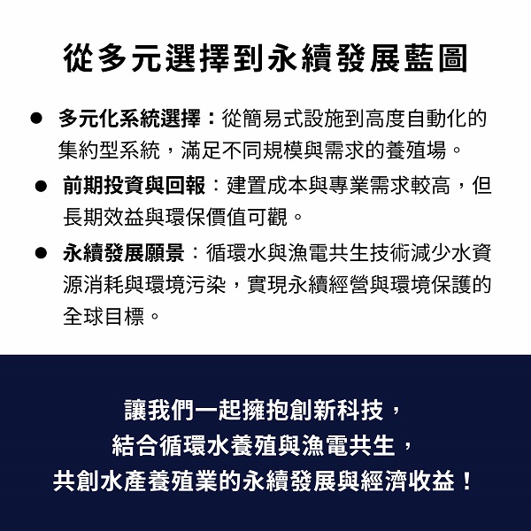 循環水系統的核心在於高效生產與永續經營,從前期建置到長期效益,都展現了無限潛力。無論是創新技術還是環境保護,循環水系統都為水產養殖業帶來前所未有的機遇與挑戰!
